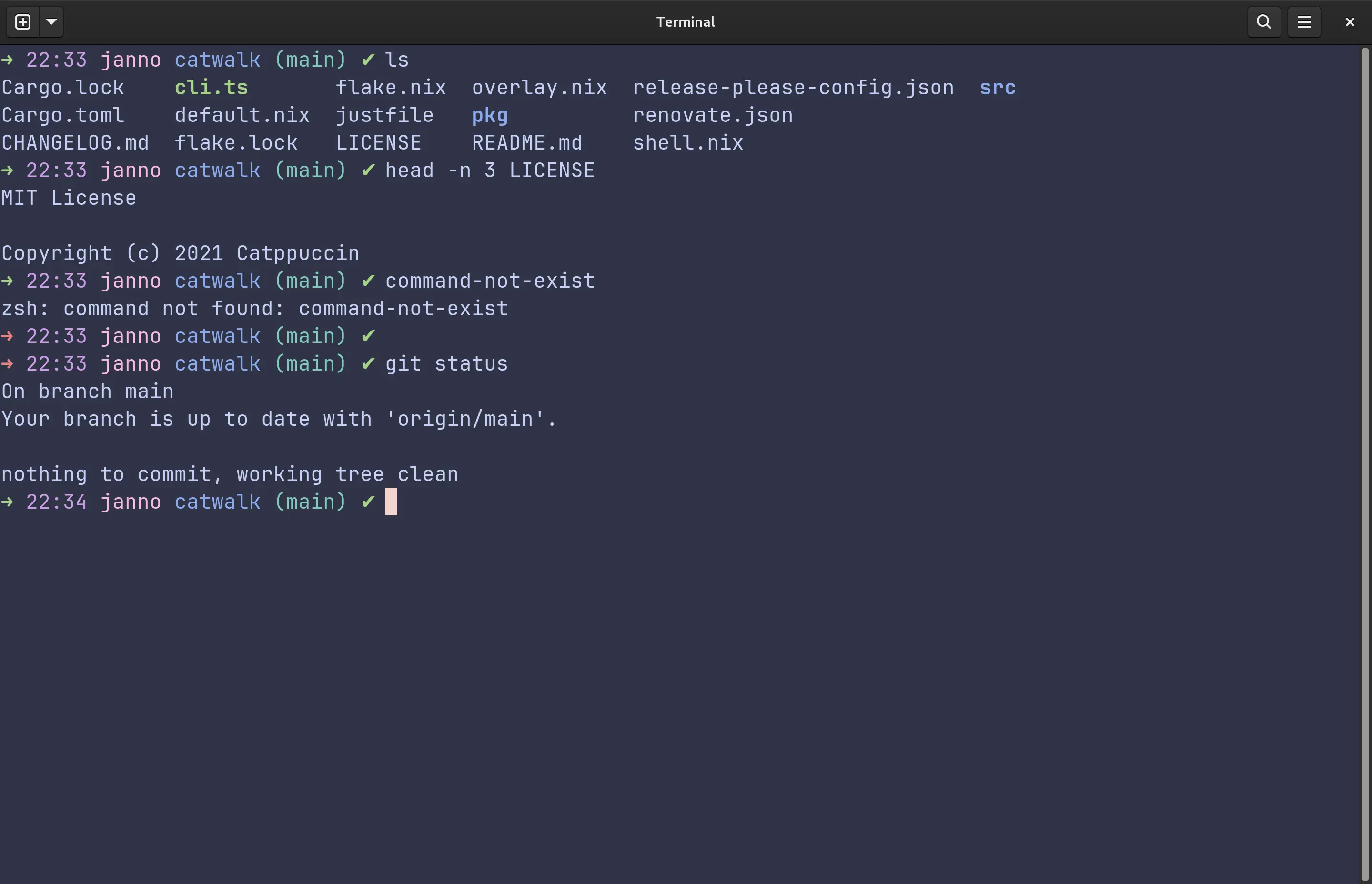 ## Installation ### Using [ohmyzsh](https://github.com/ohmyzsh/ohmyzsh) ``` sh apt update && apt install zsh git curl rsync net-tools dnsutils htop iotop tmux gnupg2 fonts-font-awesome fonts-powerline -y sh -c "$(curl -fsSL https://raw.github.com/ohmyzsh/ohmyzsh/master/tools/install.sh)" git clone https://github.com/zsh-users/zsh-syntax-highlighting.git ${ZSH_CUSTOM:-~/.oh-my-zsh/custom}/plugins/zsh-syntax-highlighting git clone https://github.com/zsh-users/zsh-autosuggestions ${ZSH_CUSTOM:-~/.oh-my-zsh/custom}/plugins/zsh-autosuggestions git clone https://devops.cloudhost.es/CloudHost/catppuccin-zsh.git mkdir ~/.oh-my-zsh/themes/catppuccin-flavors mv catppuccin-zsh/catppuccin.zsh-theme /root/.oh-my-zsh/themes mv catppuccin-zsh/catppuccin-flavors/ /root/.oh-my-zsh/themes/ mv catppuccin-zsh/.zshrc /root/.zshrc source /root/.zshrc ``` ## Setup Add the following lines to you zsh configuration: ``` sh ```